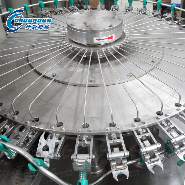 瓶子由通過風(fēng)送道傳遞,然后通過撥瓶星輪傳送至三合一機的沖瓶機。沖瓶機回轉(zhuǎn)盤上裝有瓶夾,瓶夾夾住瓶口沿一導(dǎo)軌翻轉(zhuǎn)180°,使瓶口向下。在沖瓶機特定區(qū)域,沖瓶夾噴嘴噴出沖瓶水,對瓶子內(nèi)壁進行沖洗。瓶子經(jīng)沖洗、瀝干后在瓶夾夾持下沿導(dǎo)軌再翻轉(zhuǎn)180°,使瓶口向上。洗凈后的瓶子通過撥瓶星輪由沖瓶機導(dǎo)出并傳送至礦泉水灌裝機。